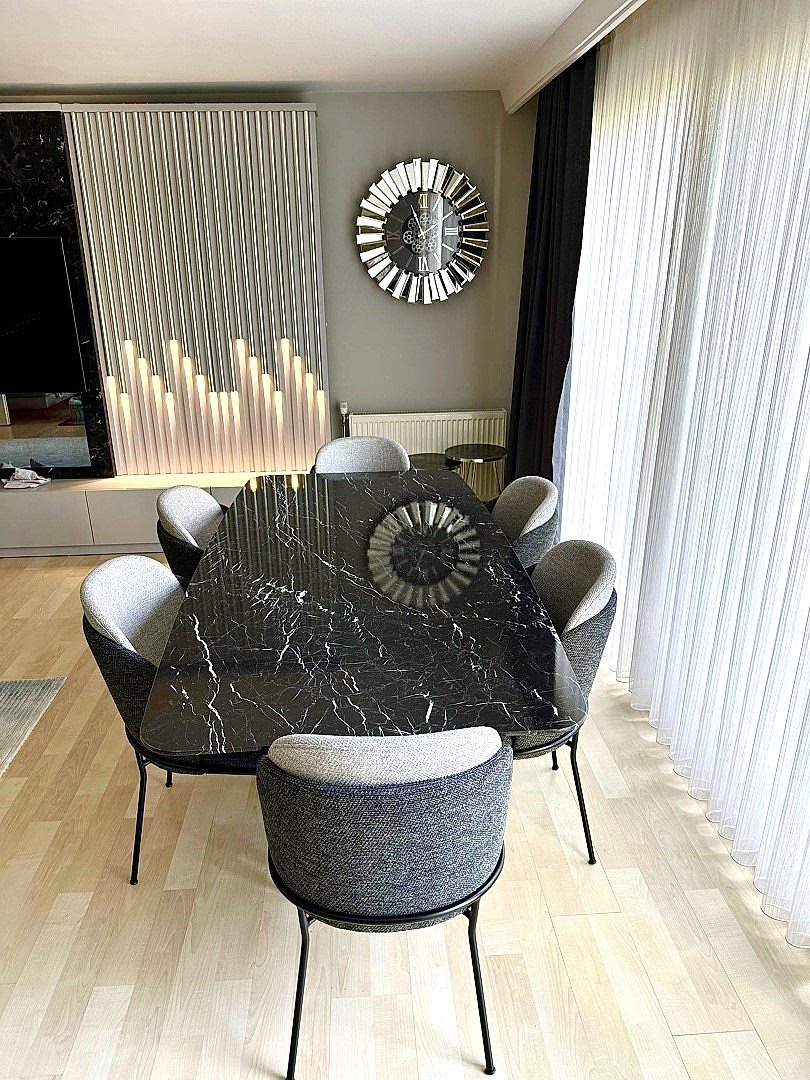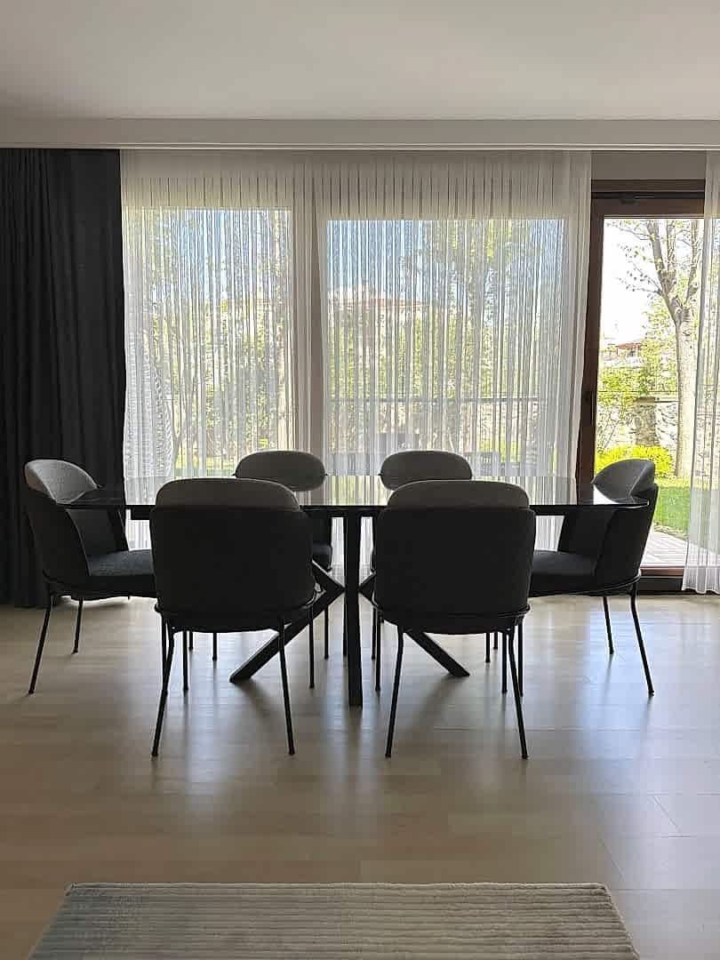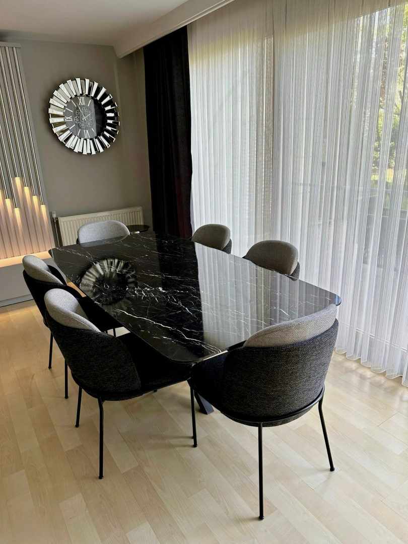 Minotti Sandalye Takımı ile Kombinlenmiş Alexander Black Mermer Masa & Mermer Yemek Masası