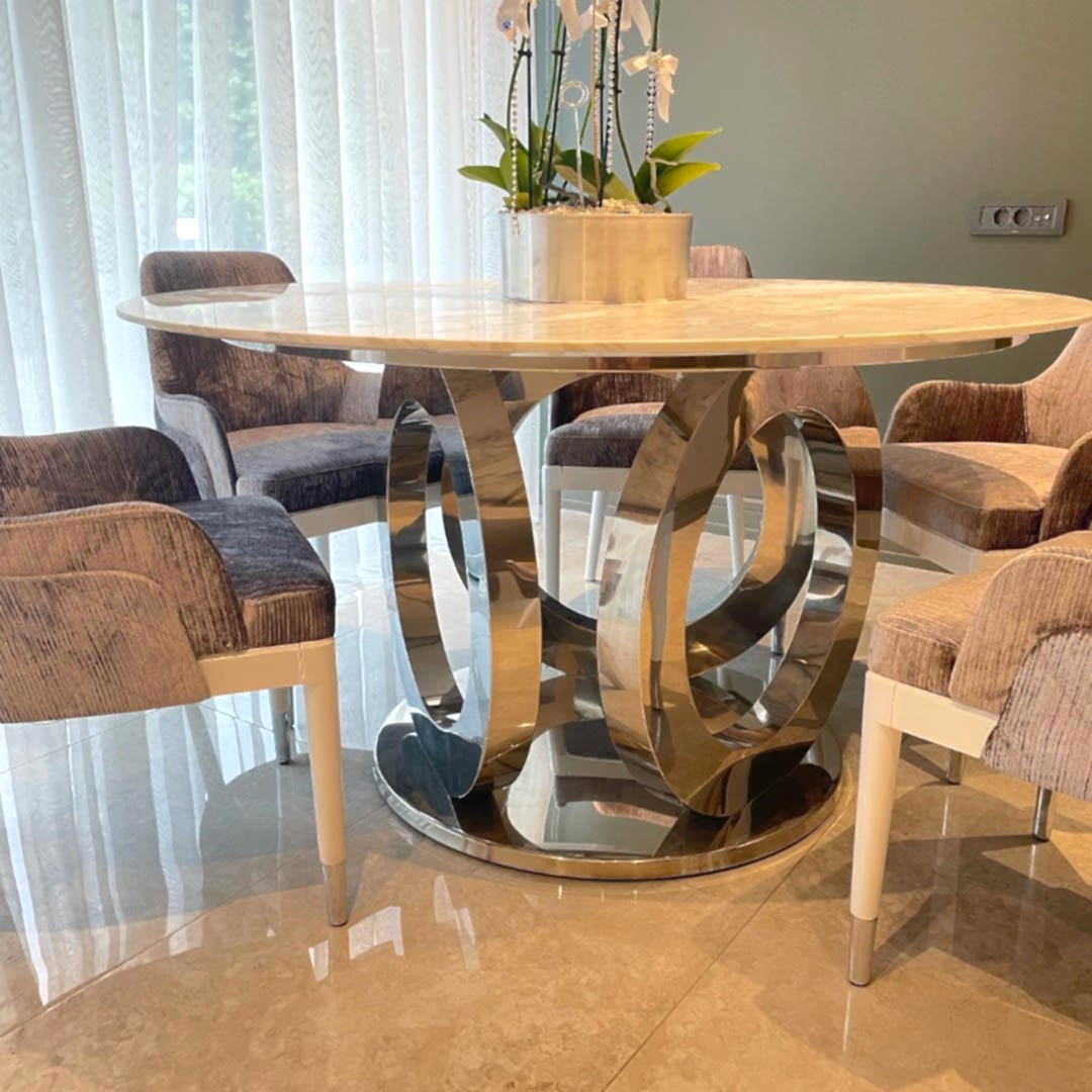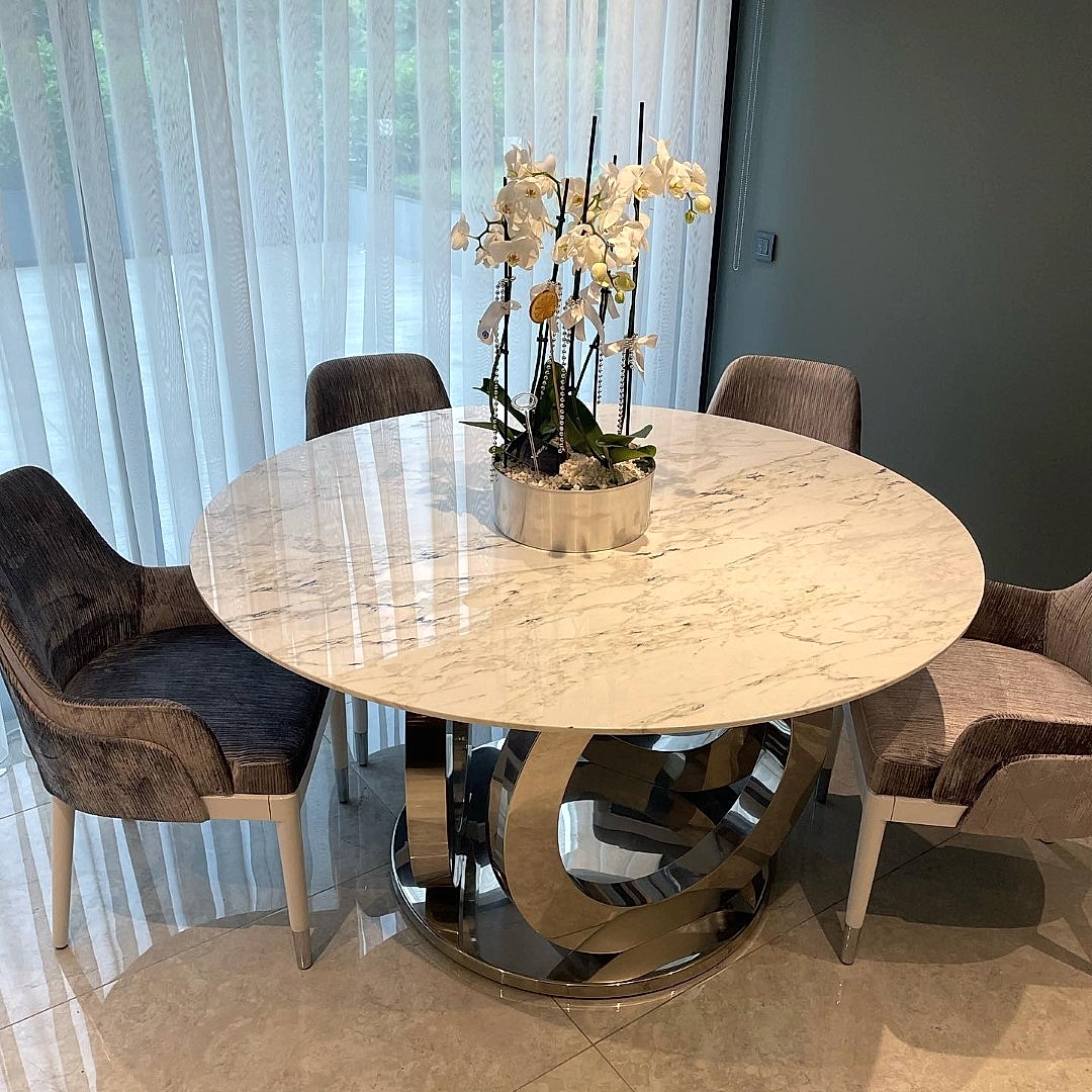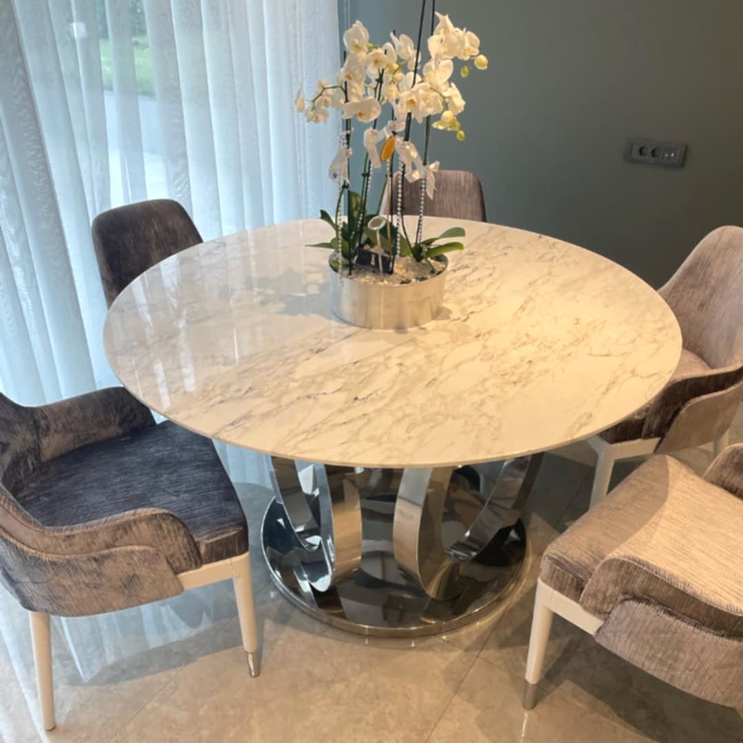 Paslanmaz çelikten üretilmiş halk ayaklı mermer masa, üst mermer Calacatta