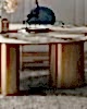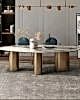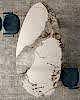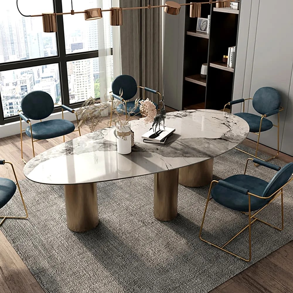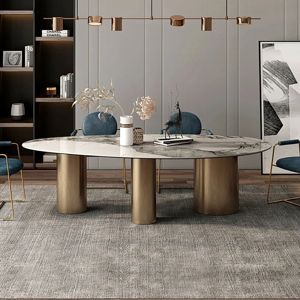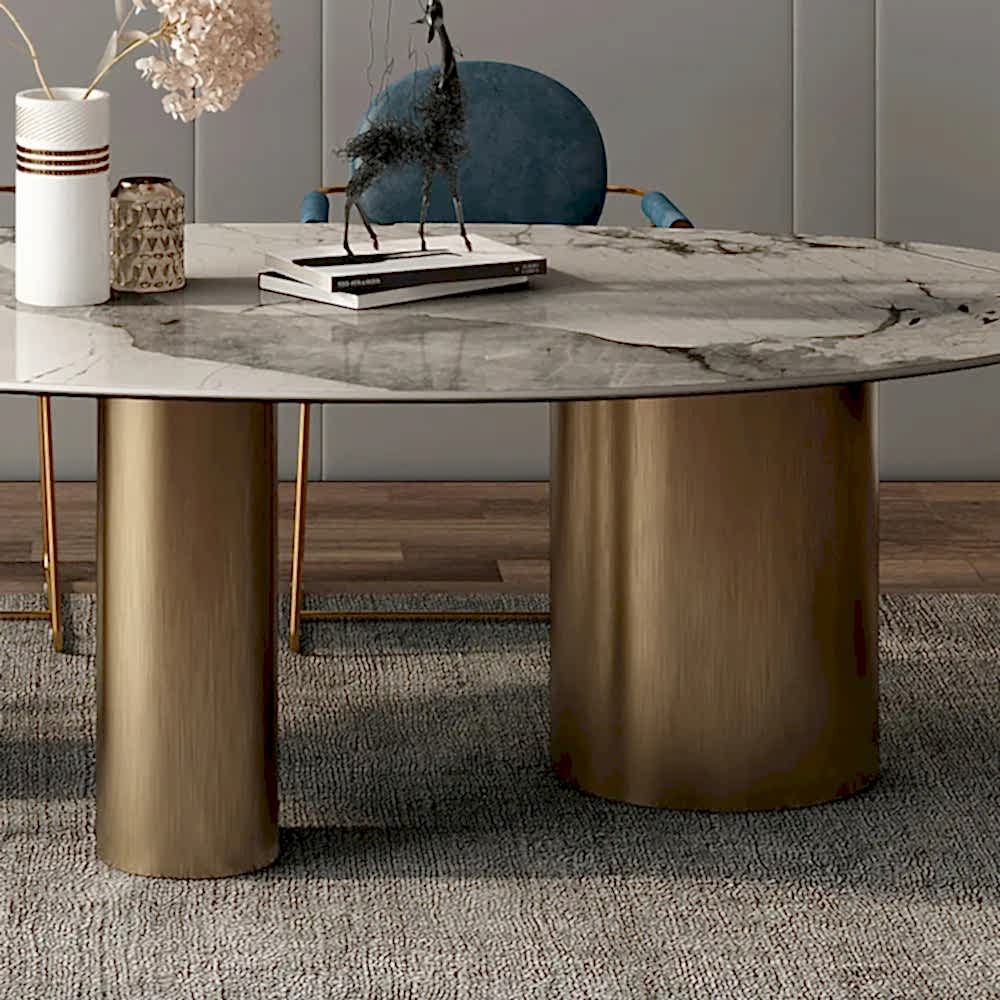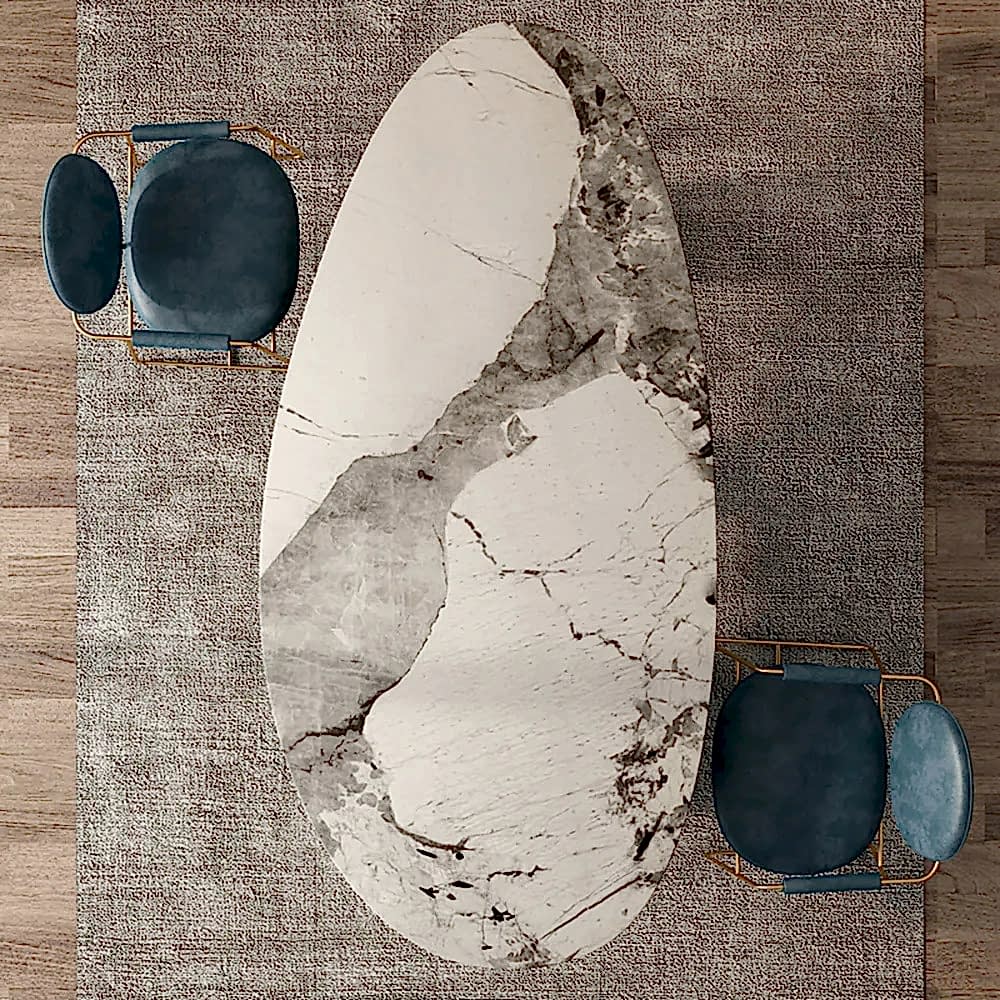 115x250cm ölçülerinde, elips kesim italyan porselen masa, mermer desenli.