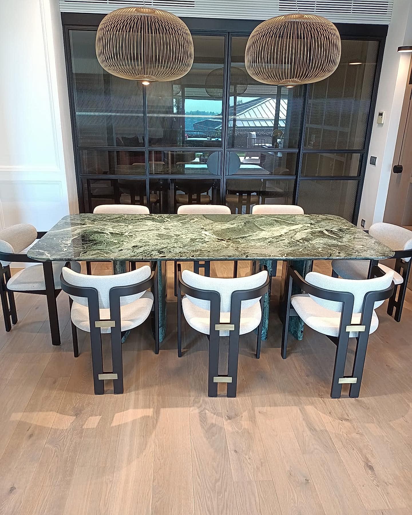 Verde Alpi Yeşil mermer masa, ayakları aynı taştan üretilmiştir.